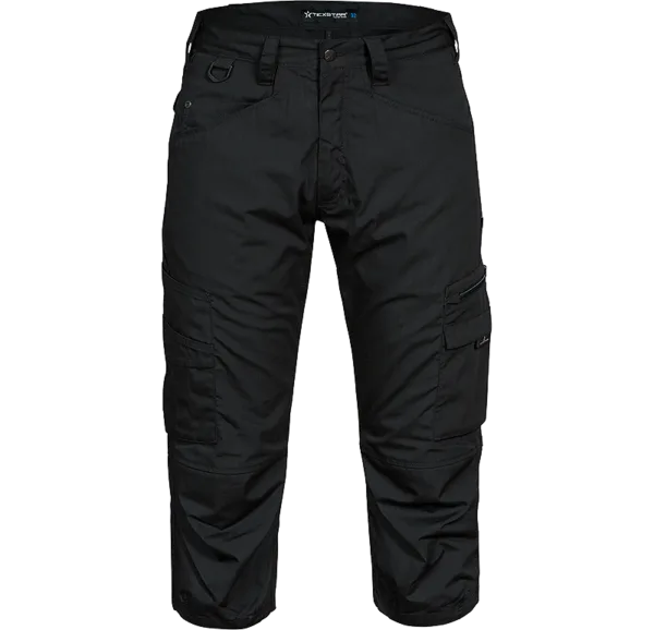 Trekvartsbyxa i lättare material. Dubbla benfickor – fraktsedelsficka med inbyggd tumstocksficka på höger sida och på vänster sida en ficka med både dragkedja och velcro-flap. Bak hittar du två dolda bakfickor med snygga ficklock.