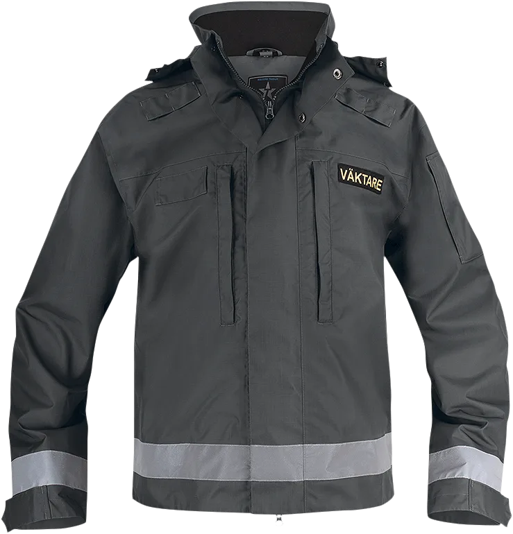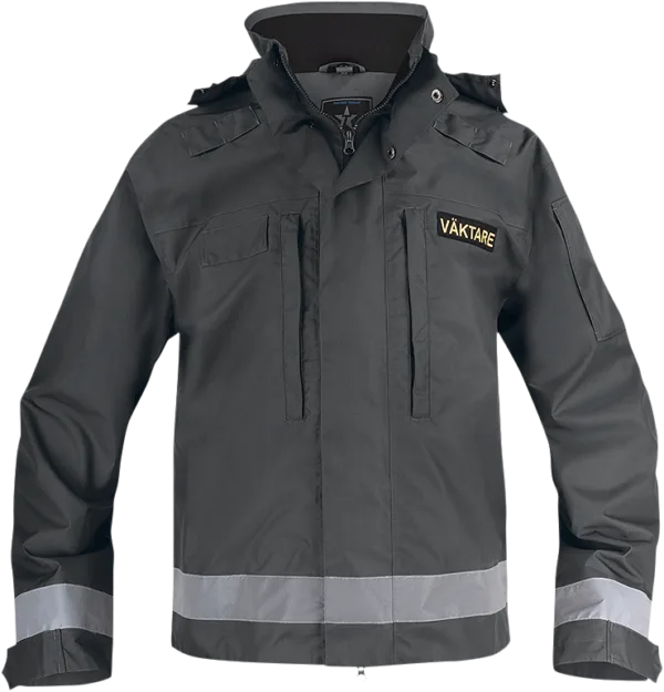 Snygg kort skaljacka med monofonhållare, namnhållare, funktionsbeteckning Väktare på kardborre ingår. Gussets under ärmarna, huva som är både avtagbar och inrullningsbar i kragen. 50 mm reflexband i ärmslut och nederkant. En ärmficka med blixtlås, två stora bröstfickor med dragkedja, en innerficka. Vind och vattentät med andasfunktion.