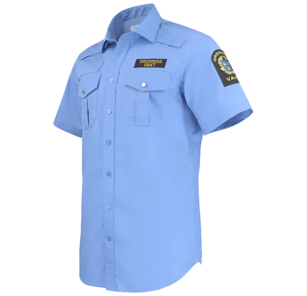 Snygg skjorta med modern krage och två bröstfickor med guldknapp. Vänster bröstficka har öppning för penna. Monofonhållare på höger och vänster axel och namnhållare höger bröst. Ordningsvaktsemblem på båda ärmar och med funktionsbeteckning vänster bröst. Reflextryck ”Ordningsvakt” på ryggen. Finns i snyggt skuren dam- och herrmodell. Den blå färgen är godkänd NCS 2142-R83B enligt Polisens FAP 670-1 (PMFS 2017_12).