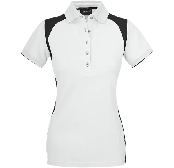 Pikétröja med tre knappar och kontrastfärg i sidopaneler, över axlarna och i ärmsluten. Med 5 % stretch sitter pikén perfekt på kroppen och du har större rörelsefrihet (snygg på kroppen även om du rör dig mycket). Unik skärning i ryggen. Snygga vita knappar, modernt elastiskt nackband som gör att plagget håller formen. Dammodellen har 5 knappar.